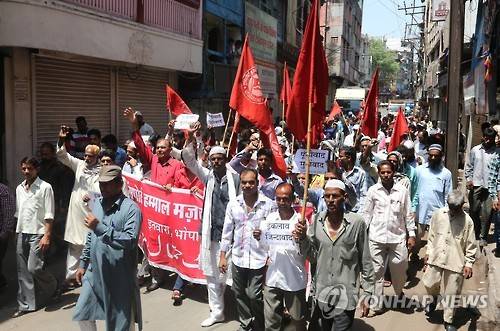 epa05285247 Communist Party of India (CPI) activists take out a rally on the occasion of International Labour Day, in Bhopal, India, 01 May 2016. Labour Day or May Day is observed all over the world on the first day of the May to celebrate the economic and social achievements of workers and fight for labourers rights. EPA/SANJEEV GUPTA