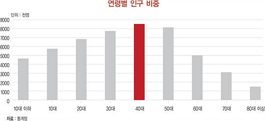 유엔이 발간한 ‘세계 인구 전망 2015년 개정판’에 따르면 국내 중위 연령은 40.6세로 나타났다. 중위 연령은 전체 인구를 연령에 맞춰 한 줄로 세웠을 때 가운데에 자리하는 값을 말한다. 대한민국의 허리가 바로 40대다.