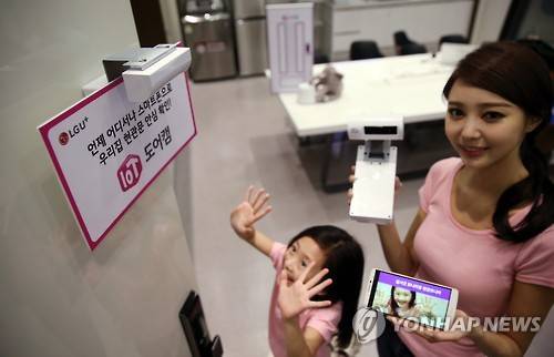 '도어캠'을 통해 집 앞 방문자를 스마트폰으로 확인하고 영상통화도 할 수 있다. LG유플러스는 "실내에서 급하게 외부인과 대화를 나누어야 할 경우 현관까지 나갈 필요가 없고, 외출 시에는 집에 있는 것처럼 외부인을 응대할 수 있어 유용하다"고 설명했다. 2016.5.3