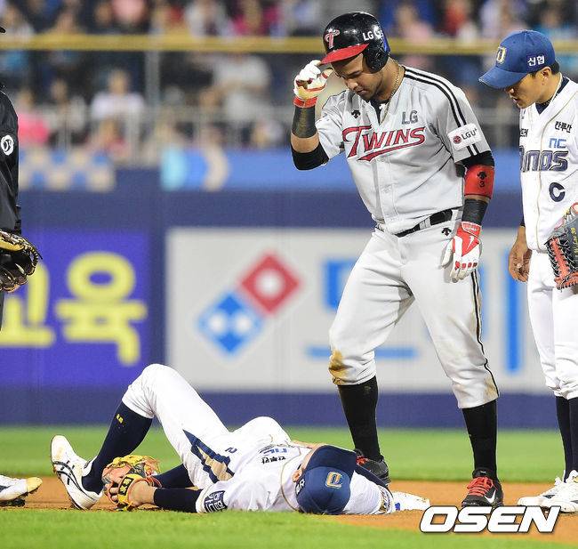 [OSEN=창원, 백승철 기자] 6일 오후 경남 창원시 마산야구장에서 열린 '2016 타이어뱅크 KBO 리그' NC 다이노스와 LG 트윈스의 경기 4회초 무사 1,2루 채은성의 3루수 앞 삼중살타 상황, 2루수 박민우가 수비 중 히메네스와 충돌해 넘어져 있다. / baik@osen.co.kr