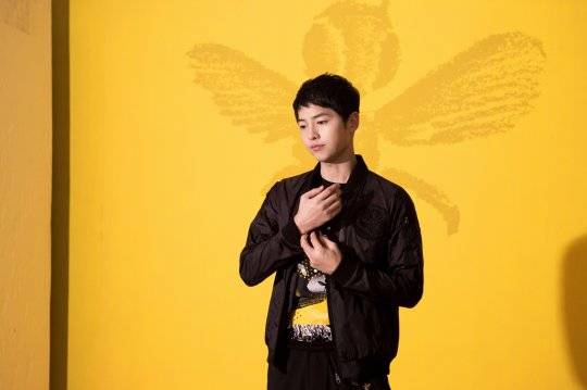 송중기는 꿀벌 프린트가 그려진 노란 배경을 바탕으로 꿀보다 달콤한 미모를 자랑해 눈길을 끌었다. 순정만화를 찢고 나온 듯한 미소와 다채로운