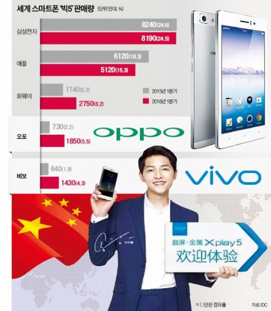 비보와 오포(OPPO) 등 중국 2세대 스마트폰 회사들이 무서운 기세로 글로벌 시장을 잠식하고 있다. 연간 성장률이 100%가 넘을 정도로 빠르게 성장하고 있다. 지난 1분기에는 레노버 샤오미 등을 밀어내고 세계 스마트폰 시장에서 처음으로 판매량 5위 안에 들었다.