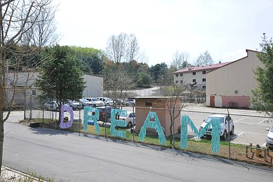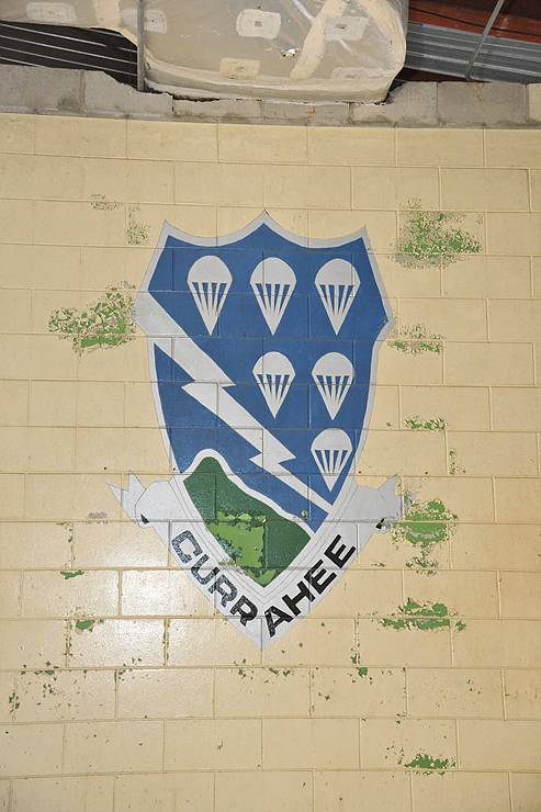 (사진) 체육관 벽면에 남겨진 ‘커래히(Currahee)’ 부대 마크. 캠프그리브스에 마지막으로 주둔했던 506연대의 상징이다. ⓒ 서범세 기자