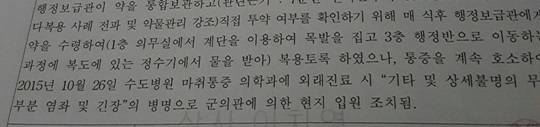 약을 투약하기 위해 1층 내무반과 3층 행보관 사무실을 오르내렸야 했다. 통증으로 수차례 계단에서 구르는 아들을 행보관이 목격하였으나,아들이 하루치 약을 달라는 건의을 무시, 약을 제때에 투약받지 못했다.