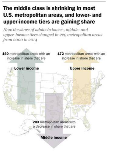 퓨리서치 센터가 11일(현지시간) 발표한 '미국 대도시에서 중산층의 붕괴' 보고서에 따르면 2000∼2014년까지 14년간 미국 229개 대도시 가운데 203곳에서 중산층이 무너졌다.