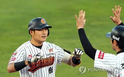 (부산=연합뉴스) 조정호 기자 = 12일 부산 사직야구장에서 열린 프로야구 넥센 대 롯데경기. 1회말 무사 1·3루에서 롯데 김상호가 스리런 홈런을 때리고 홈으로 들어오고 있다. 2016.5.12