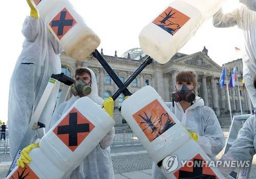 epa05301161 Activists of the German Federation for the Environment and Nature Conservation (BUND) protest against the use of the herbicide glyphosate, in front of the Bundestag parliament in Berlin, Germany, 12 May 2016. EPA/RAINER쟆ENSEN