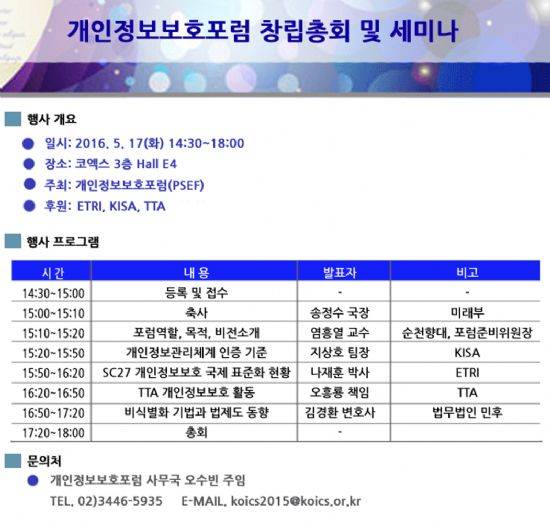 창립총회 참가신청은 온라인(https://goo.gl/forms/mujllhXWbj)으로 할 수 있으며, 자세한 문의는 개인정보보호포럼 사무국(☏02-3446-5935, koics2015@koics.or.kr)으로 하면 된다.