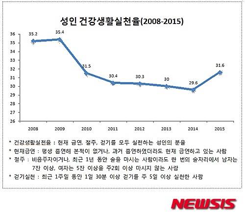 금연, 저위험음주, 걷기실천 3가지 항목에서 모두 합격점을 받은 성인은 31.6%로 2014년(29.6%) 대비 소폭 증가했다. 하지만 3명중 2명 이상은 건강생활 개선이 필요한 셈이다.