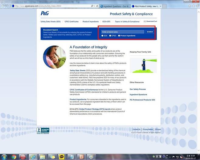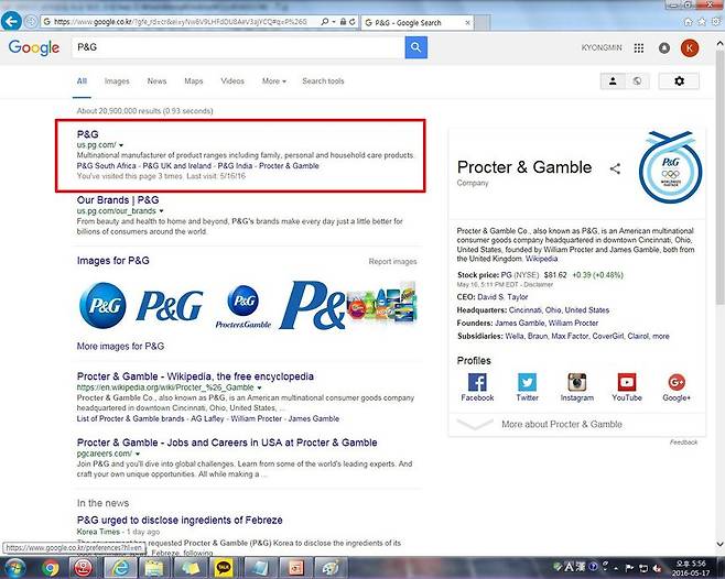 의심많은 저는 아예 이 제품을 제조한 P&G 본사에 들어가봅니다.제일 쉬운 길, 구글에 <p&g>를 칩시다. </p&g>
