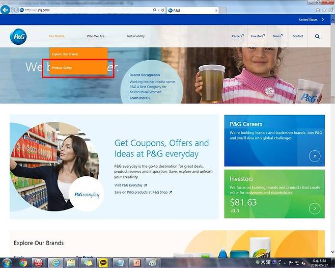 가장 상단 링크로 뜨는 P&G 사이트에 들어갑니다.홈페이지 상단 메뉴 바 중 를 클릭하면 하위 메뉴 중 드디어 제가 찾던 제품안전성, Product Safety가 있네요!