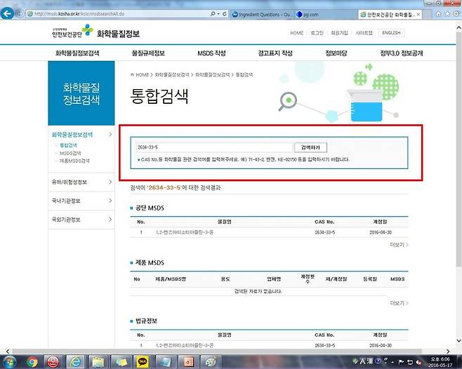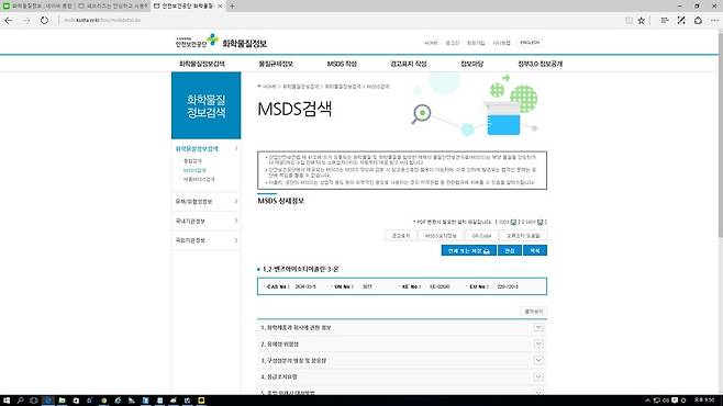 안전보건공단 화학물질정보 검색창에 이 번호를 입력하니