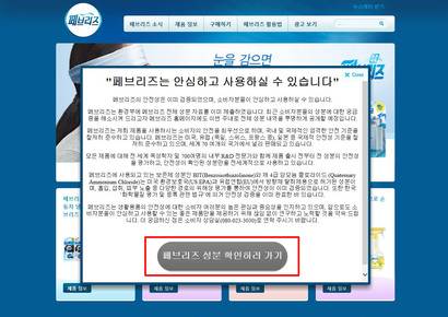 오, 이런 창이 뜨는군요. “페브리즈는 안심하고 사용하실 수 있습니다”하지만 의심많은 저는 하단에 마련된 ‘페브리즈 성분 확인하러 가기’ 버튼을 클릭합니다.