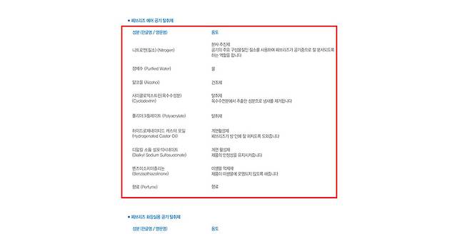 몇 개 되지도 않은 각 성분 옆에 적힌 용도에는 하나같이 ‘냄새를 제거한다’‘제품이 미생물이 오염되지 않도록 해준다’는 등 긍정적 효과만 적혀 있습니다.