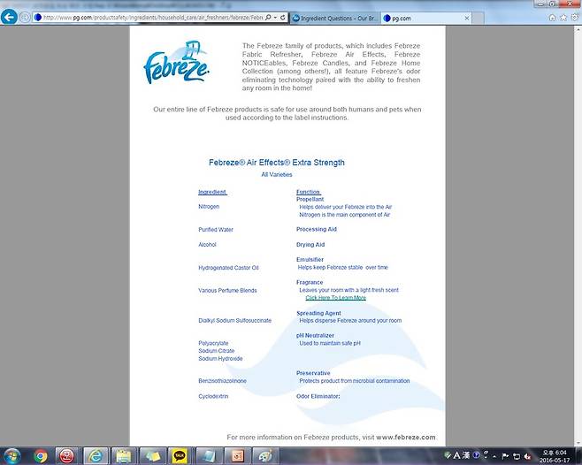 실제로 미국의 한 환경시민단체(EWG)는 페브리즈 공기탈취제 성분을 자체적으로 분석한 결과,