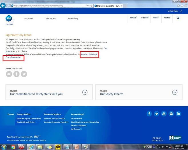 하단 부분 라는 항목의 내용 가운데“Information on our Fabric Care and Home Care ingredients can be found on the Product Safety & Compliance site.”라는 부분이 있습니다.“우리 회사의 섬유 및 실내 관리 제품의 성분에 대한 정보는 제품 안전&준수 사이트에서 확인할 수 있습니다.”라고 하니, 이 사이트로 넘어가봅니다.