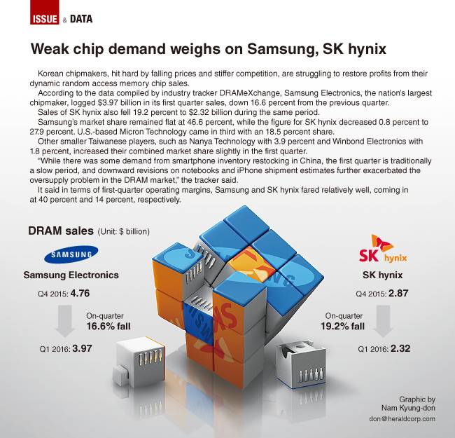 According to the data compiled by industry tracker DRAMeXchange, Samsung Electronics, the nation’s largest chipmaker, logged $3.97 billion in its first quarter sales, down 16.6 percent from the previous quarter.