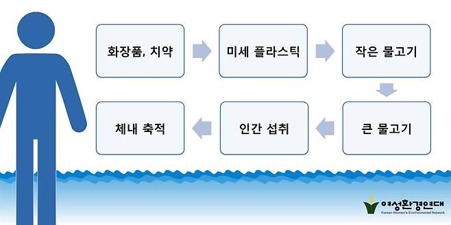 | ▲ 화장품 속 미세 플라스틱이 환경에 미치는 영향 화장품 속 미세 플라스틱은 하수 정화장치를 통과해 강을 거치고 바다로 흘러들어 가 바다에 영향을 미친다. |