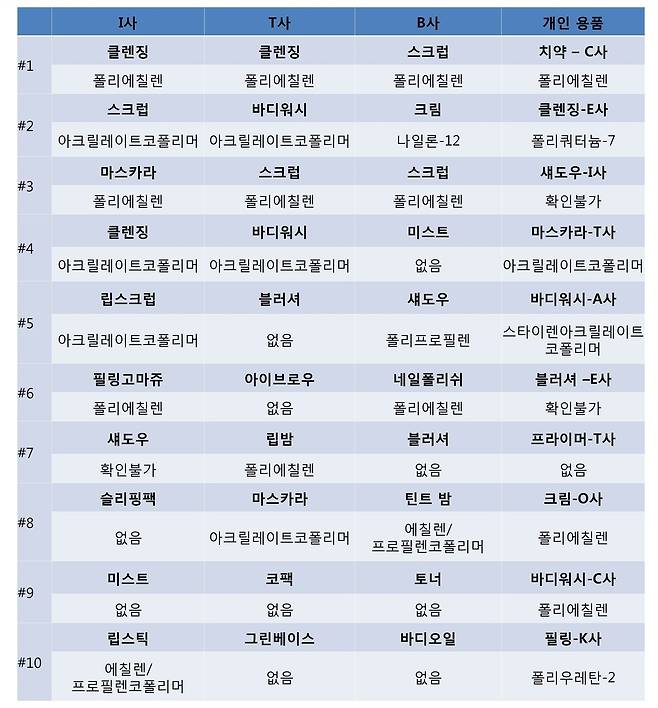 여성들이 자주 사용하는 5개의 화장품 매장을 방문하여 제품을 살펴보았다. 무작위로 10개의 제품을 골라, 각 제품의 전 성분 표시를 보고 플라스틱 성분이 함유되어 있는지 알아본 것이다. 방문한 화장품 매장은 10대, 20대 여성을 주 타깃으로 하는 I사, T사, B사였고, 매장 탐방에는 이 브랜드의 화장품을 자주 사용하는 20대 초중반 여성 4명이 참여하였다.