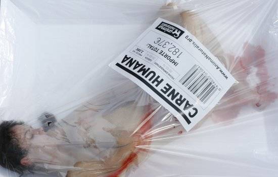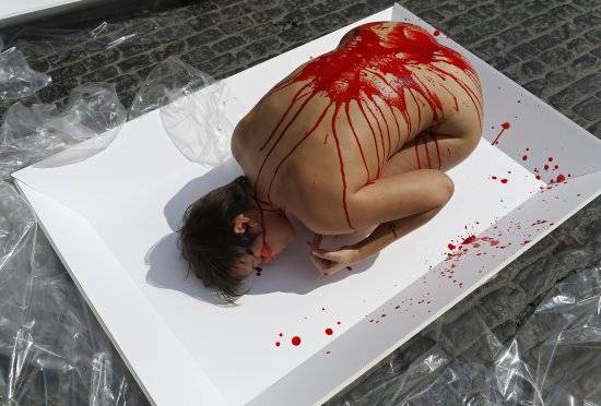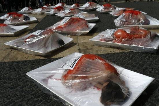 한 동물 보호 운동가가 22일(현지시간) 스페인 바르셀로나에서 고기 포장 용기에 담겨진 고기 모양의 퍼포먼스를 벌이고 있다.