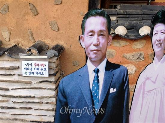| ▲ '박정희 대통령 생가'에 기념촬영을 하기 위해 놓여 있는 박정희 전 대통령 부부 모형 사진 뒤에 "내외분 어깨 위로 손 얹지 마세요"라는 '촬영 주의사항'이 적혀 있다. |