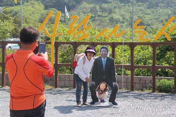 | ▲ 고 노무현 전 대통령 서거 7주기를 하루 앞둔 22일 경남 김해 진영읍 봉하마을에 많은 참배객들이 줄을 잇고 있는 가운데, 한 가족이 노 전 대통령 사진을 배경으로 사진을 찍고 있다. |