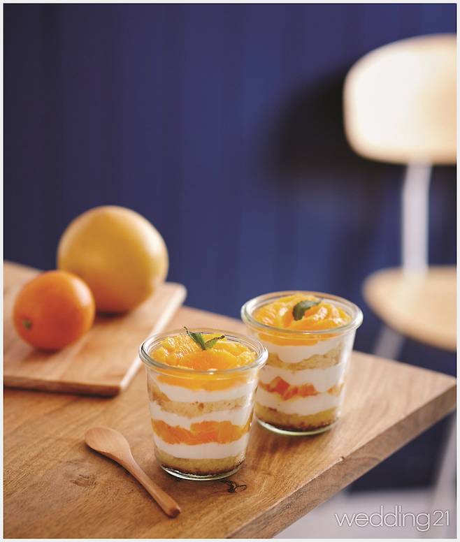 "상큼한 오렌지 향이 가득해 봄에 무척 잘 어울리는 디저트예요.보기만 해도 기분이 상큼하게 좋아지죠 .이런 비주얼의 디저트를 여자친구에게 선물하며‘너를 꼭 닮은 디저트야.’라고 말해보는 건 어떨까요?”