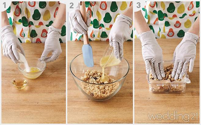 하루견과 3봉, 뮤즐리 2컵, 버터·꿀 1/4컵씩, 황설탕 1/5컵
