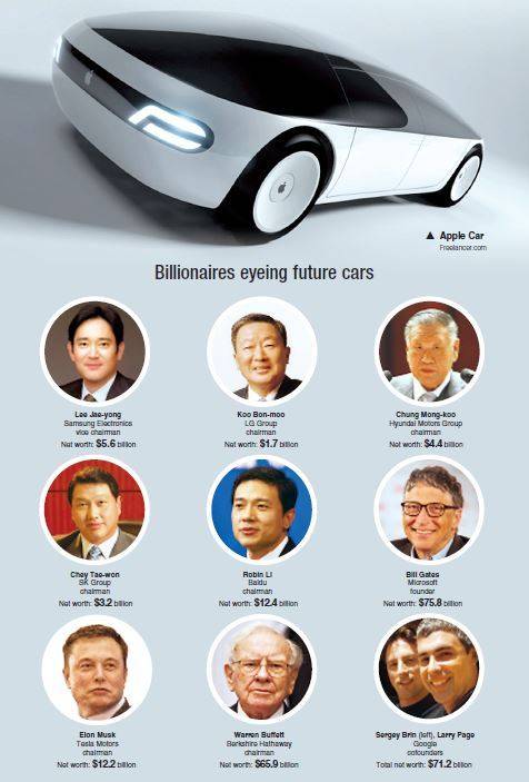 The most notable business with billionaires from various industries joining is the next-generation vehicle sector. Vehicles equipped with advanced technology can have several functions, such as an Internet connectivity, autonomous driving capability and eco-friendly electric motors.