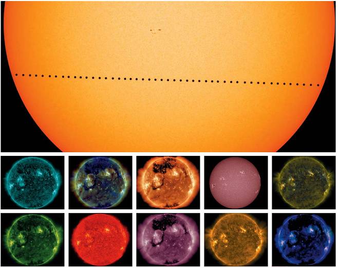 황금색 바다(태양)를 가로지르는 조그마한 돛단배(수성). 지난 9일 수성이 태양면을 가로지르는 일면통과(日面通過) 현상이 지구 반대편에서 관측됐다. 수성이 공전하다가 태양과 지구 사이에 들어오는 이 현상은 아메리카 대륙의 동부 지역과 서유럽에서만 관측됐다.