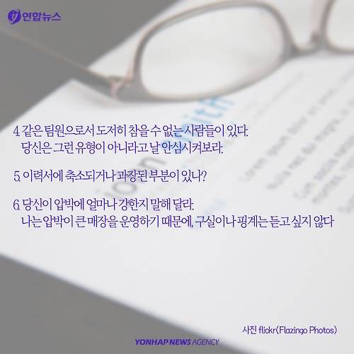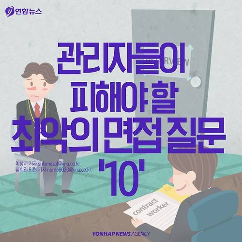 (서울=연합뉴스) 이상서 기자·심희진 인턴기자 = 미국 경제지 포천이 선정한 500대 HR 기업에서 부사장을 지내고 있는 인사 전문가 리즈 리안이 최근 포브스지에 기고한 '나약하고 두려움 많은 관리자의 형편없는 면접 질문 10가지'를 소개합니다.