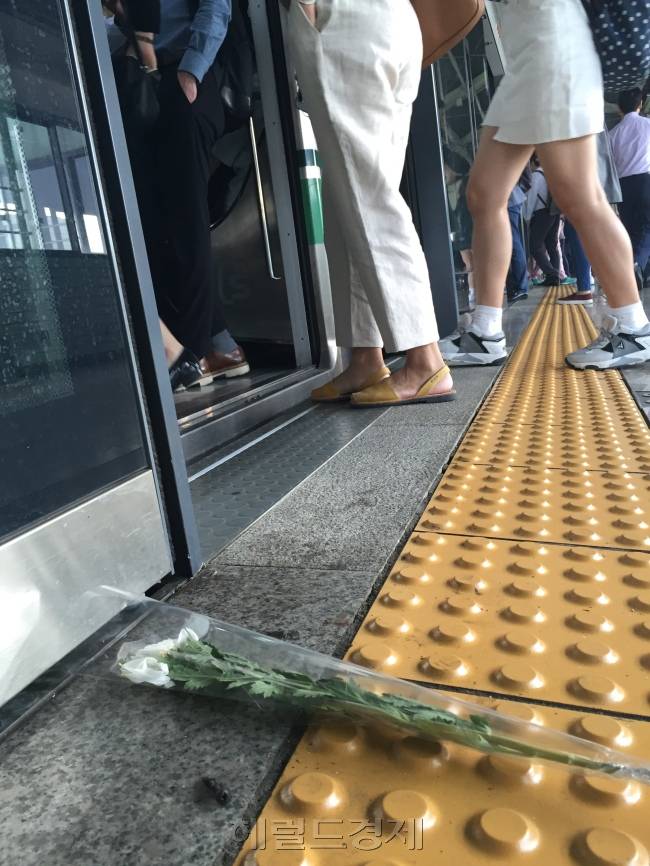 [헤럴드경제=김진원(글ㆍ사진) 기자] 30일 아침 8시 지하철 2호선 구의역 강남 방면 9-3 승강장에 국화꽃 한 송이가 놓여 있다. 국화꽃 옆에는 기름에 찌든녹슨 나사못 하나가 뒹굴고 있다. 출근길에 오른 시민들은 국화꽃을 스쳐 바쁜 발걸음을 옮겼다.
