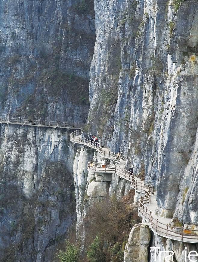 은시대협곡을 보기 위해 케이블카를 타고 오른다. 7분 정도 오르니 삐죽한 봉우리와 몽글몽글한 산들이 어깨를 겨루고 있는 모습이 눈에 들어온다. 기기묘묘한 바위들이 기다렸다는 듯이 나타나고, 물결 모양의 돌들이 이어진 루문석낭을 지나니 좁은 틈이 등장한다. 한 사람이 겨우 지나갈 수 있는 바위 ‘일선천’. 그 다음에 나타난 것이 은시대협곡의 상징인 절벽잔교다. 어려운 공사를 하면서 고생했을 분들에게 경의를 표하며 발걸음을 내디딘다. 한 발짝씩 들어갈수록 신선의 세계로 들어서는 것만 같다. 아래는 천길 낭떠러지. 겨우 500m밖에 되지 않는 길이었지만 한없이 길게 느껴진다. 쿵쿵거리는 심장과 후들거리는 다리를 안고 경이로운 풍경 속을 걷는다.