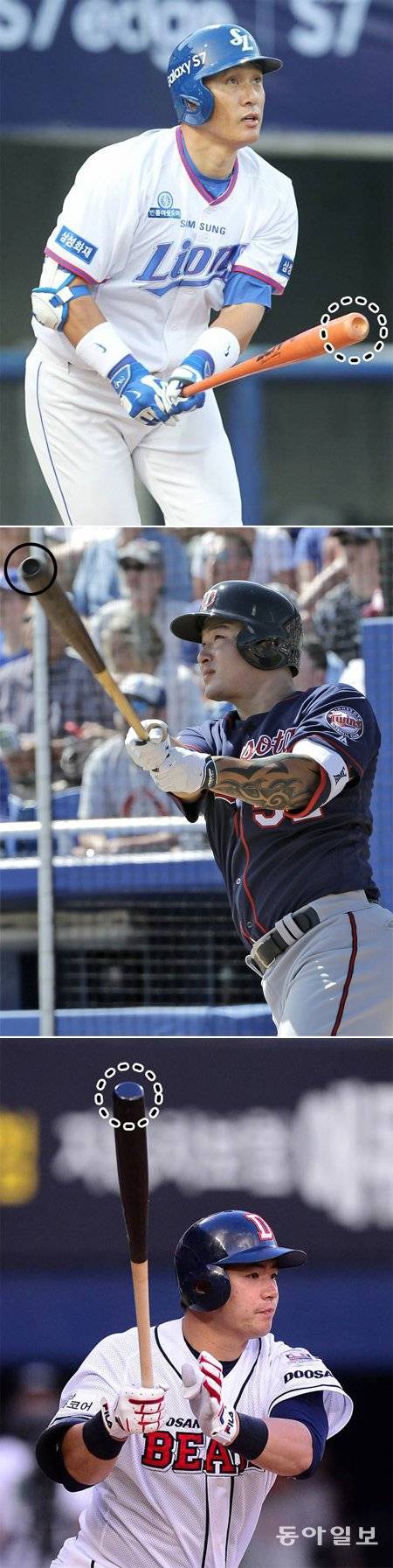 | 프로야구 타자들 야구방망이를 자세히 관찰하면 선수마다 방망이 머리끝의 모양이 다르다는 것을 알 수 있다. 삼성 이승엽(맨위 사진)이나 미네소타 박병호(가운데 사진)는 컵 모양으로 끝을 판 방망이를 들고 타석에 들어선다. 방망이에 컵을 파면 무게를 최대 30g까지 줄일 수 있다. 반면 두산 김재환은 볼록한 모양이다. 끝부분을 평평하게 일자로 깎는 선수도 있다. 동아일보DB |