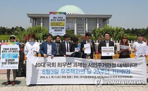 (서울=연합뉴스) 한종찬 기자 = 2일 오전 서울 여의도 국회 앞에서 UN-Habitat 민간위원회, 민달팽이 유니온, 참여연대 등 주거·시민사회단체 회원들이 임대차보호법 개정 등을 촉구하며 기자회견을 하고 있다. 2016.6.2