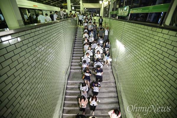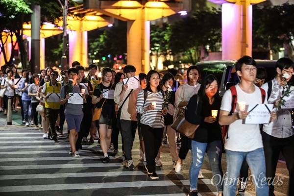 | ▲ 서울 지하철2호선 구의역 스크린도어 수리도중 사망한 19살 김모씨를 추모하는 시민들이 2일 오후 사고현장인 구의역 9-4승강장에 모여 추모행사를 연 뒤 고인의 분향소가 차려진 인근 건국대병원 장례식장까지 촛불행진을 벌였다. |