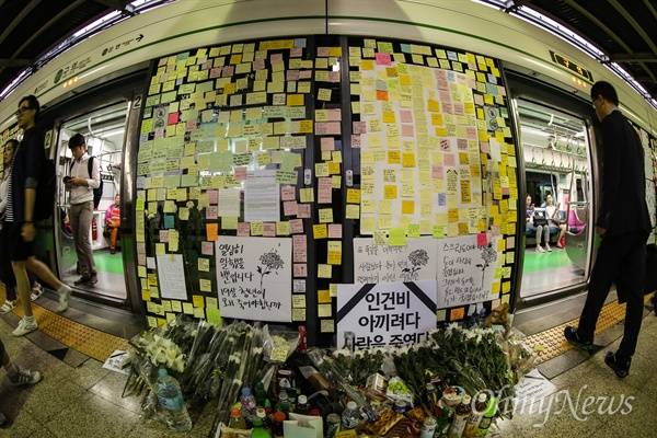 구의역은 그의 분향소가 차려진 건국대병원 장례식장에서 지하철 한 개역 떨어진 곳에 있다. 이날 오후 8시, 김씨가 희생된 구의역 9-4 승강장 앞 그를 추모하는 시민들이 하나, 둘 모이기 시작했다. 누군가가 이곳을 찾은 시민들에게 검은리본을 나눠줬다. 시민들의 가방에 검은리본과 노란리본이 나란히 달리기 시작했다.