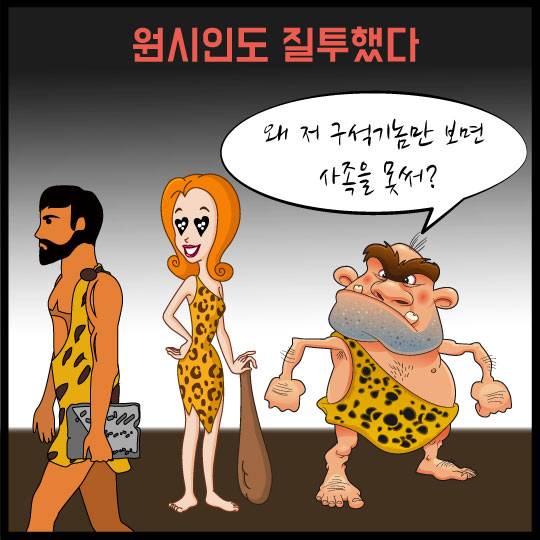 인간의 질투는 구석기시대의 감정이 거의 변형되지 않고 지금까지 유지되고 있는 것이라고 진화심리학자들은 얘기한다. 구석기의 원시인들은 먹이를 구하고 짝짓기를 하고 자식을 기르는 문제를 해결하는 노하우를 신경회로망에 기록해 뇌 속에 새겨놓았다. 이분들이 직면했던 상황에 기초하여 만들어 놓은 사랑의 원리들을 현대인들이 지금도 실천하고 있다고 보면 된다는 얘기다. 미국의 데이비드 버스는 1994년 '욕망의 진화'라는 책에서 6개 대륙 37개 문화권의 성 의식을 분석하고 남녀관계에서 발생하는 질투심에 대해 이렇게 진단을 해놓았다.