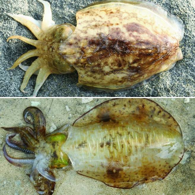 아무튼 두 종류 모두 우리가 흔히 오징어라 부르는 살오징어(Japanese common squid)와는 달리 몸통이 두툼하고 넓적한 데다 지느러미가 마름모꼴이 아닌 타원형으로 몸통 표면에 불규칙한 줄무늬가 선명하다.