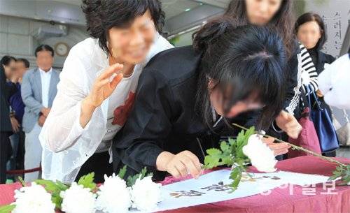 | 3일 오전 10시 광주 북구 그린장례식장에서 진행된 고 양대진 씨의 발인식에서 고인의 아내(가운데)와 유가족들이 “어디 가느냐”며 오열하고 있다. 광주=박영철 기자 skyblue@donga.com |