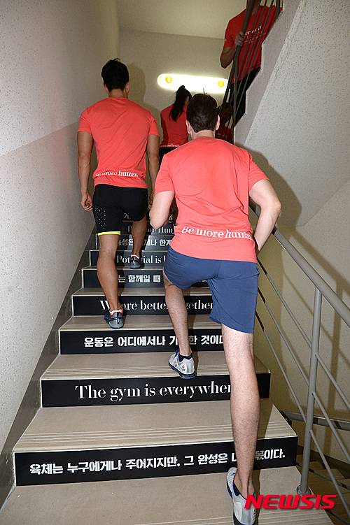 【서울=뉴시스】이영환 기자 = 5일 오전 서울 구로구 쉐라톤 서울 디큐브시티 호텔에서 열린 '쉐라톤 챌린지 2016'에서 참가자들이 계단 오르기를 하고 있다.