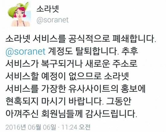 소라넷은 6일 트위터를 통해 “소라넷 서비스를 공식적으로 폐쇄합니다. @soranet 계정도 탈퇴합니다”라며 이 같이 밝혔다.
