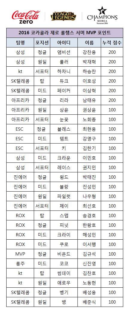 코카콜라 제로 롤챔스 서머 2016 정규시즌 MVP 포인트(6월 6일 기준)