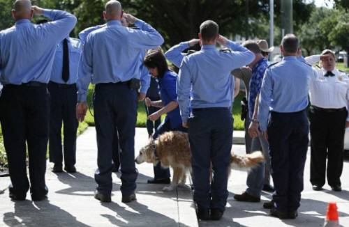 브리트니는 함께한 동료 소방관들의 경례를 받으며 동물병원으로 들어갔다.