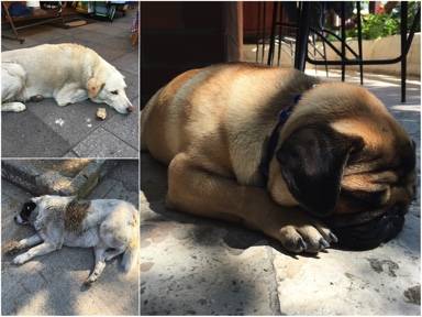 | ▲ 그늘마다 목줄도 안 맨 견공들이 자리를 잡고 한량짓을 하고 있다. |