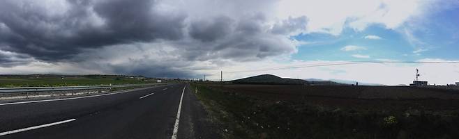 | ▲ 파노라마로 찍은 카파도키아의 하늘. 왼쪽 지역은 먹구름이 모여 비를 뿌리고 있고, 오른쪽 지역은 구름 없이 화창하다. |