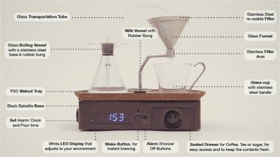 제품은 상부와 하부로 나누어져 있습니다. 상부에는 물을 끓이고 커피를 담는 비이커가 있고, 하부는 시계 알람과 물을 끓이는 전원장치, 커피나 차, 설탕 등을 담아두는 조그만 서랍이 있습니다.