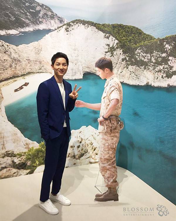 '블러썸 엔터테인먼트'는 지난 10일 공식 페이스북에 송중기 사진을 공개했다. 유시진 판넬 앞에 선 모습이었다. 환한 미소로 브이를 그리고 있었다.