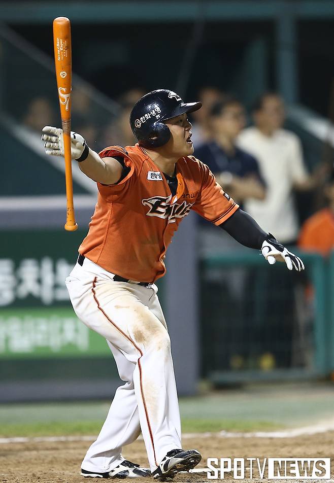 [스포티비뉴스=대전, 곽혜미 기자] 12일 오후 대전 한화생명이글스파크에서 열린 2016 KBO 리그 한화 이글스와 LG 트윈스의 경기, 9회말 1사 만루 상황에서 한화 양성우가 끝내기 희생타를 날리고 있다.