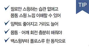 느낌을 기억하면서 조금씩 스윙 크기를 크게 해보세요. ‘팔’로 크게 하는 게 아니라 꼬임을 크게 하는 겁니다.
